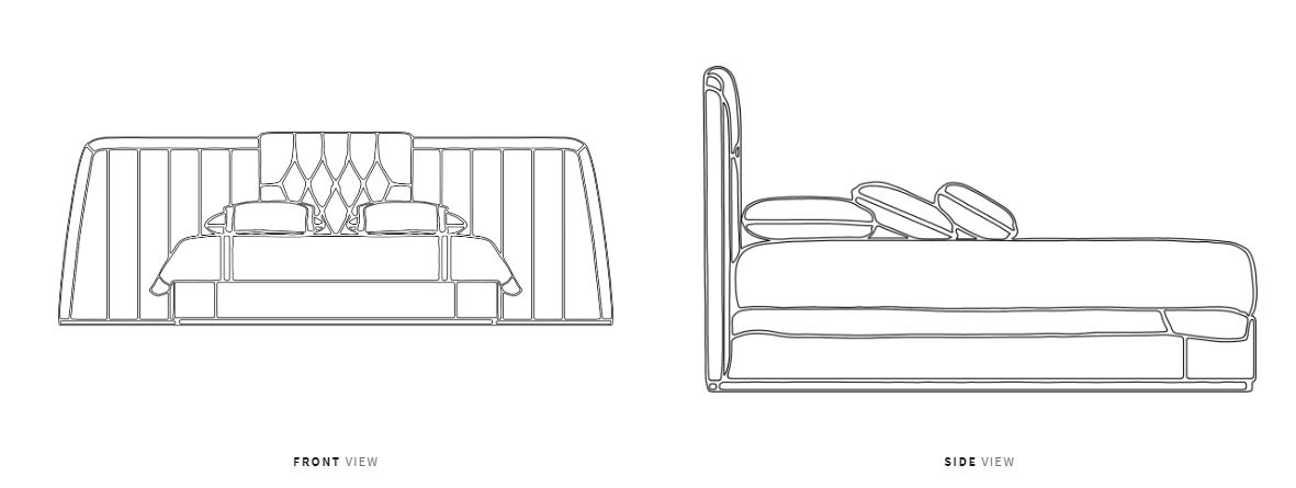 Struktura masivního dřeva a překližky. Zvětšená hlavička postele pro noční stolky; prošívané capitonné a vertikální pásky dekorace. Lakovaná základna z bukového dřeva. Polyuretanová pěnová výplň s několika hustotami. Dřevěná lamela v ceně. K dispozici ve velikosti krále. Postel je k dispozici na vyžádání.