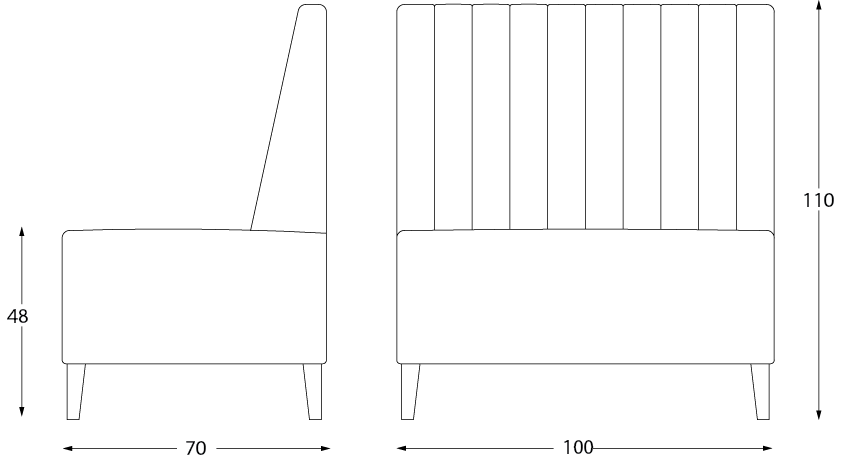 Modulární lavička vysoká, masivní dřevěné nohy. Plně čalouněné sedadlo a svislé čalouněné čalounění v přední části. Zadní část zad není čalouněná.