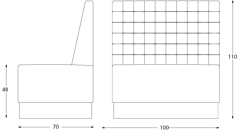 Modulární lavice vysoká. Plně čalouněné sedadlo a čalouněný čalouněný přední díl. Zadní část zad není čalouněná. Uzavřený podstavec z laminátu.