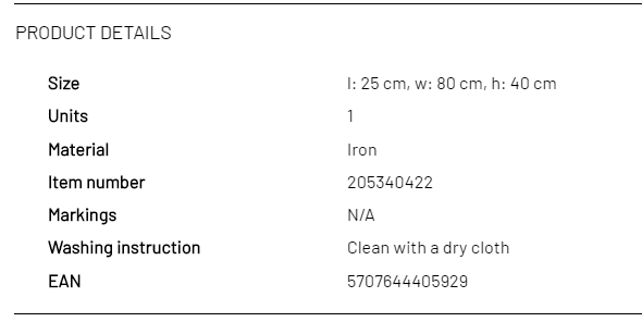 Rack Model C od House Doctor je krásná reinterpretace průmyslového stojanu. Tento stojan má dokonalý a krásný design, který má mnoho použití. Vzhled je také nadčasový a bude nepochybně krásným zvratem k vašemu již existujícímu dekoru. Použijte Rack Model C jako úložné řešení ve vašem obývacím pokoji, ložnici nebo na chodbě. Její struktura je jednoduchá a lehká s městským nádechem, díky čemuž je ideální pro většinu domů a pokojů. Rozměr: 25x80 cm, h .: 40 cm