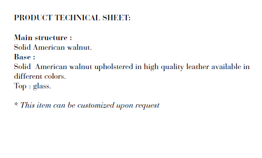 Hlavní struktura: Masivní americký ořech. Základna: Masivní americký ořech čalouněný vysoce kvalitní kůží v různých barvách. Nahoru: sklo.