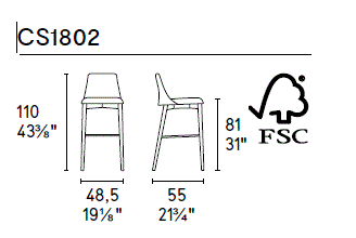 Stools with dried solid wood frame. Shell with metal core, seat and backrest upholstered with high-density cold-foamed polyurethane 65 kg/m³ - 4.05 lb/ft³. MDF panel seat base. Metal footrest. Nylon glides. Tested according to ANSI/BIFMA X5.1.