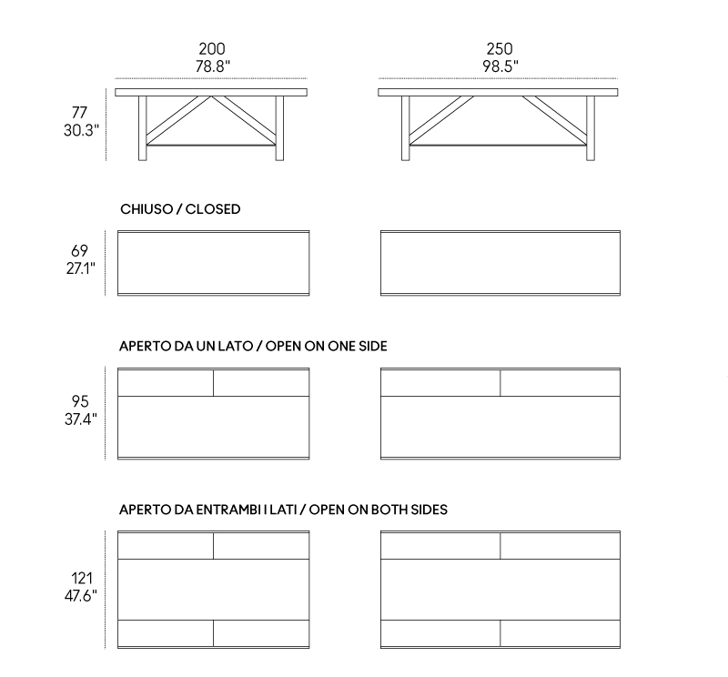 Capriata is a table featuring an unusually narrow and long top. Such proportions, beyond being very practical in certain furniture combinations, allow full visibility of the perfect dimensions of the supporting structure, reminiscent of wood roof trusses. The design is completed with an extensible solution, because instead of stretching, Capriata elongates on both long sides by removing the holding frame and unfolding the extensions contained therein. At its maximum extension, this feature almost doubles the surface area.