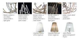Metal frame available in the following colour combinations: – Velvet White and Light Gold – Velvet White and Satin Nickel – Namibia and Satin Nickel – Namibia and Light Gold – Pure Steel and Copper The collection is available with diffuser in glass transparent Pyrex (code 525 ) or with white or brown organza lampshades (code 524). Transparent crystals pendants. Note: the ceiling lamps, table lamp and the floor lamp are available only with the diffuser in organza. Table and floor lamps with brushed base.