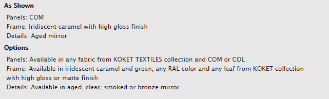 Gentle curves of dark bronze undulate to create the Simone screen’s charismatic form. A bold yet subtle work of art, Simone’s soft panels of upholstery and elegant panes of antique mirror are sure to bring the allure of vintage glamour to any space.