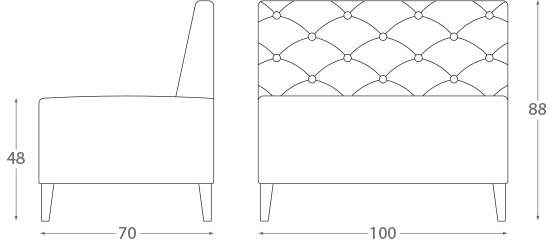 Panca modulare bassa, gambe in legno massello. Sedile e schienale completamente imbottiti. Frontale dello schienale con rivestimento capitonné (abbottonato). Parte posteriore non imbottita.